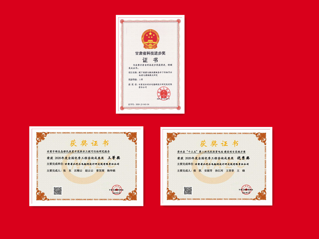 科研成果在工程實踐中開花結果,多個項目獲技術表彰獎勵:《民勤縣紅崖山水庫加高擴建工程》獲甘肅省優秀工程勘察設計一等獎;《石羊河流域重點治理項目西營河專用輸水渠工程》《古浪縣生態移民暨扶貧開發黃花灘項目水利骨干工程》《大通河納子峽水電站工程地質勘察》《昌馬水庫樞紐工程地質勘察》分別獲甘肅省優秀工程勘察設計二等獎;《甘肅中部生態移民扶貧開發供水工程可行性研究報告》獲全國優秀工程咨詢成果獎三等獎;《清水縣“十三五”第二批光伏扶貧電站項目》獲全國優秀工程咨詢成果獎優秀獎。