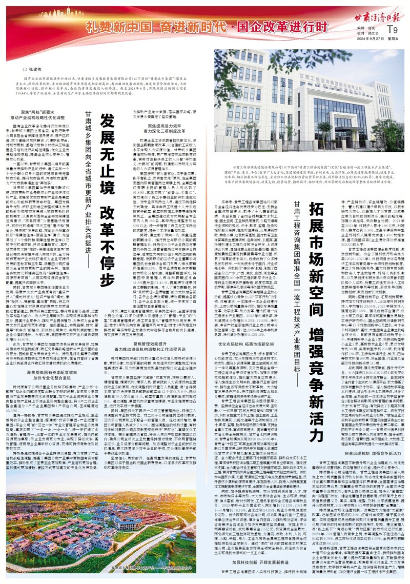 奮進(jìn)新征程,甘肅工程咨詢集團(tuán)將全面貫徹落實(shí)黨的二十屆三中全會(huì)精神,準(zhǔn)確把握改革重點(diǎn)任務(wù),持續(xù)推動(dòng)國(guó)有企業(yè)做強(qiáng)做優(yōu)做大,著力提升改革質(zhì)量和效能,不斷推進(jìn)黨的建設(shè)與生產(chǎn)經(jīng)營(yíng)深度融合,聚焦勘察設(shè)計(jì)主業(yè),大力發(fā)展綠色技術(shù)、數(shù)字技術(shù)等新興產(chǎn)業(yè),加快培育新質(zhì)生產(chǎn)力,增強(qiáng)高質(zhì)量發(fā)展動(dòng)能,加快建設(shè)全國(guó)一流工程技術(shù)產(chǎn)業(yè)集團(tuán)。