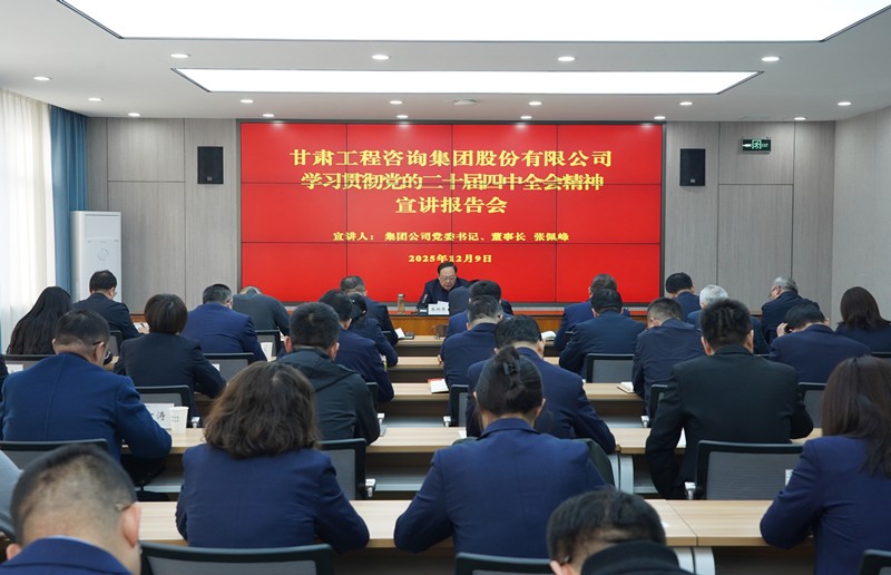 12月9日,甘肅工程咨詢集團召開學習貫徹黨的二十屆四中全會精神宣講報告會。集團公司黨委書記、董事長張佩峰作專題宣講報告,圍繞全會重大意義、核心要義及“十四五”發展成就、“十五五”時期目標任務等進行了系統闡釋,并結合集團實際提出貫徹落實的思路舉措。