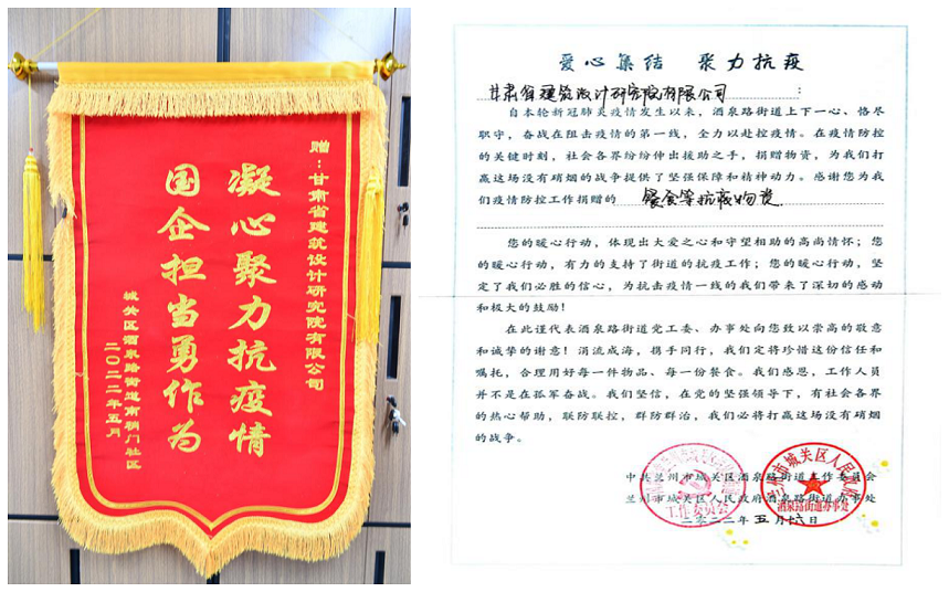 凝心聚力抗疫情 國企擔當勇作為:酒泉路街道向甘肅省建筑設計研究院有限公司贈送錦旗