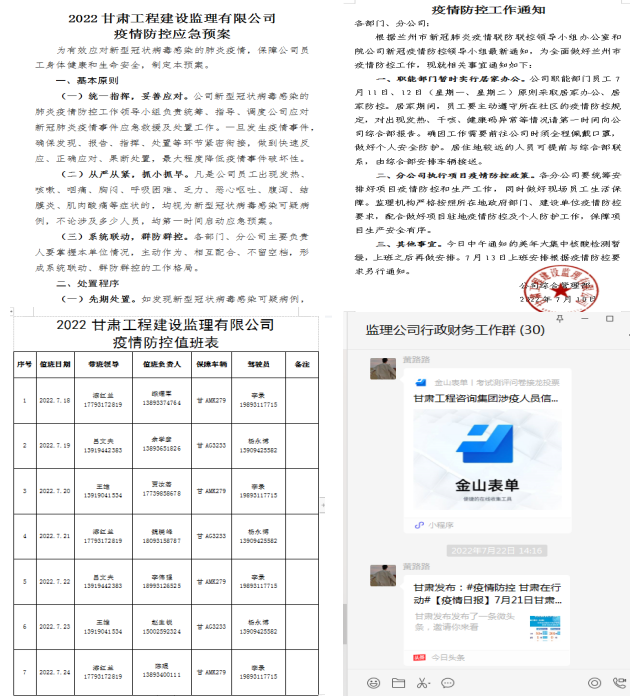 面對疫情“大考”,甘肅建筑設(shè)計院以高度的責(zé)任感守護(hù)疫情防控的“省院”防線,在阻擊疫情方面,堅持聞令而動、令行禁止,做好自身防護(hù)的同時,選派干部響應(yīng)號召下沉街道,派出志愿者助力轄區(qū)防控,把省市的各項防控舉措落實落細(xì)落到位;在生產(chǎn)經(jīng)營方面,發(fā)揮科技企業(yè)優(yōu)勢,統(tǒng)籌把握疫情防控與重點(diǎn)工程服務(wù)保障的關(guān)系,做到勘察服務(wù)準(zhǔn)時高效、外業(yè)作業(yè)安全有序,把損失降到最低。建筑設(shè)計院各生產(chǎn)單位扭住關(guān)鍵點(diǎn)、打好主動戰(zhàn),用一項項“硬核”舉措實現(xiàn)“自救”解困。瞧!這里就有一份來自建筑設(shè)計院子公司監(jiān)理公司的“戰(zhàn)報”。