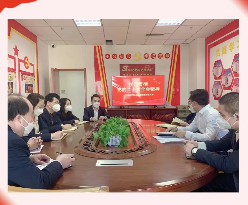 黨的二十大勝利召開以來,甘肅省招標咨詢集團有限責任公司黨委高度重視,將學習宣傳貫徹黨的二十大精神作為當前和今后一個時期的首要政治任務,通過多形式、全覆蓋的方式,積極抓好貫徹落實,持續推動黨的二十大精神轉化為加快各項工作高質量發展的強大動力,努力促使黨的二十大精神在招標咨詢集團迅速落地生根、開花結果。