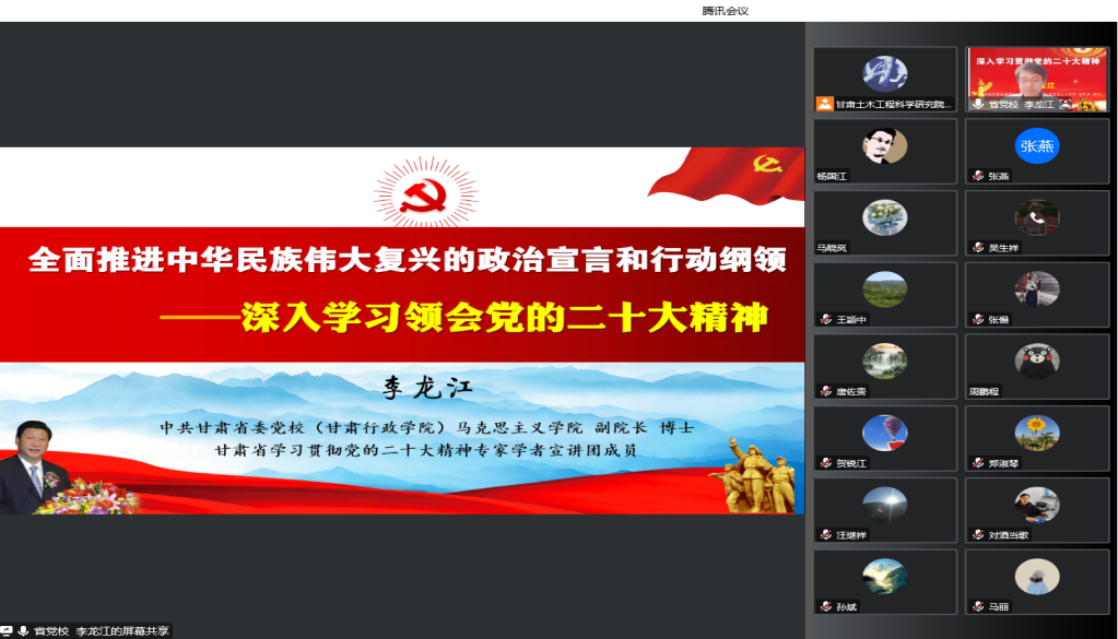 12月14日,甘肅土木工程科學研究院有限公司以視頻會議形式召開黨委理論學習中心組學習(擴大)會議暨黨的二十大精神專題培訓輔導講座。黨委副書記、監(jiān)事會主席、工會主席張磊主持會議,領導班子成員、全體黨員、中層干部、入黨積極分子參加。