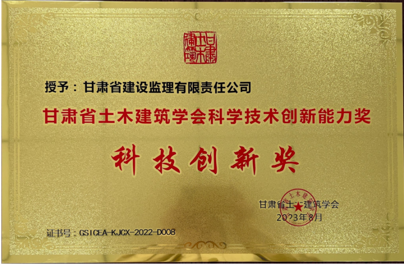 近日,省建設(shè)監(jiān)理公司榮獲“甘肅省土木建筑學會科技創(chuàng)新獎”。此獎項充分肯定了公司核心技術(shù)能力,彰顯了公司的品牌實力和行業(yè)影響力。