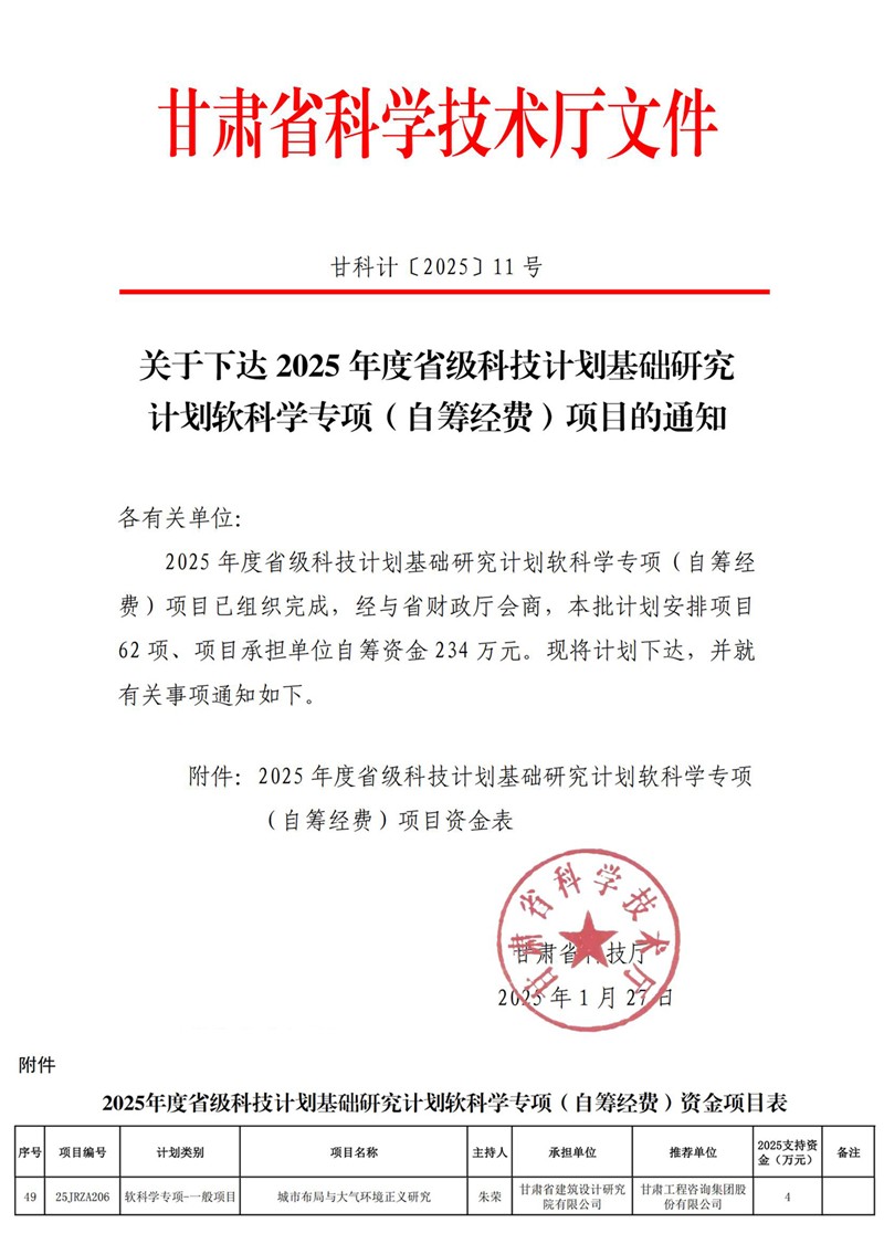 近日,甘肅省科技廳公布了2025年省級科技計劃基礎研究計劃軟科學專項(自籌經(jīng)費)項目立項結(jié)果,省建筑設計院申報的“城市布局與大氣環(huán)境正義研究”項目獲批立項。